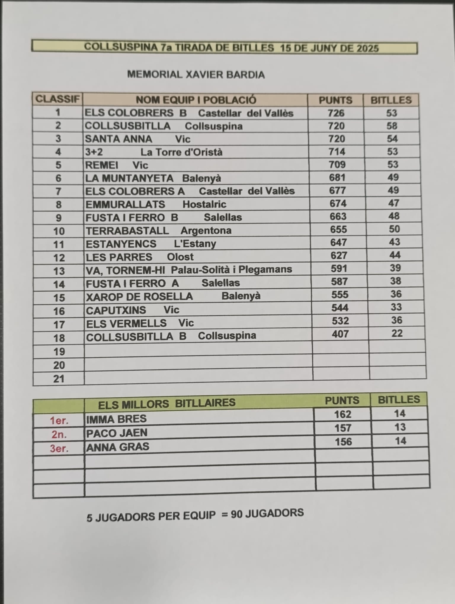 El diumenge, 15 de juny del 2025, vam viure una jornada memorable al nostre poble amb la celebració de la 7a edició de la Tirada de Bitlles de Collsuspina. Fins a 90 jugadores i jugadors hi van participar, repartits en 18 equips vinguts d’arreu.